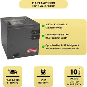 Enhance your HVAC system with the Goodman 3.5 Ton R32 Vertical Evaporator Coil (CAPTA4230D3), designed for maximum efficiency and long-lasting performance. Optimized for use with R-32 refrigerant, this evaporator coil features advanced technology that significantly boosts system efficiency while extending its lifespan.